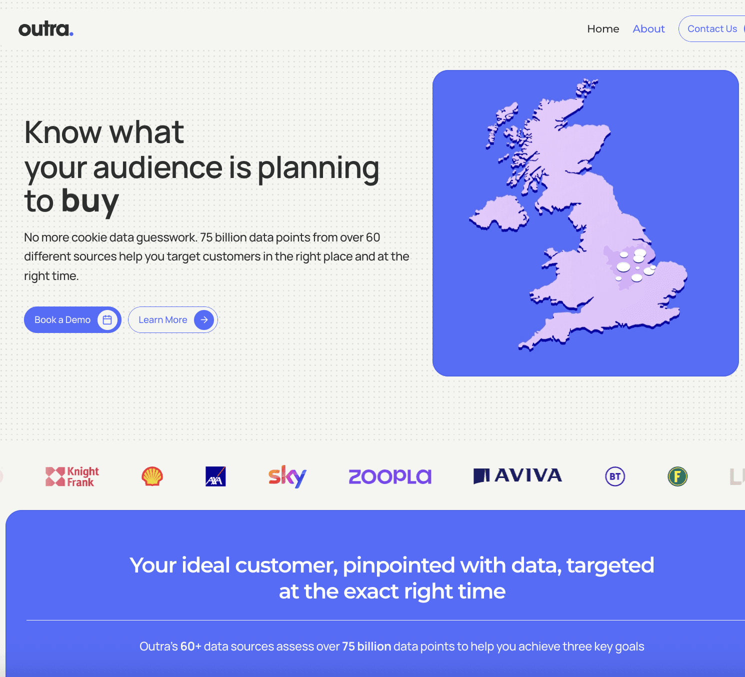 Outra provides the audience data that household names like Sky, Shell, Zoopla and AXA rely on to power their campaigns. The status quo of audience targeting is to rely on one source of data – usually website cookies or limited social media demographics. Outra gives customers access to 60 different, reliable data sources which provide a combined 75 million data points.