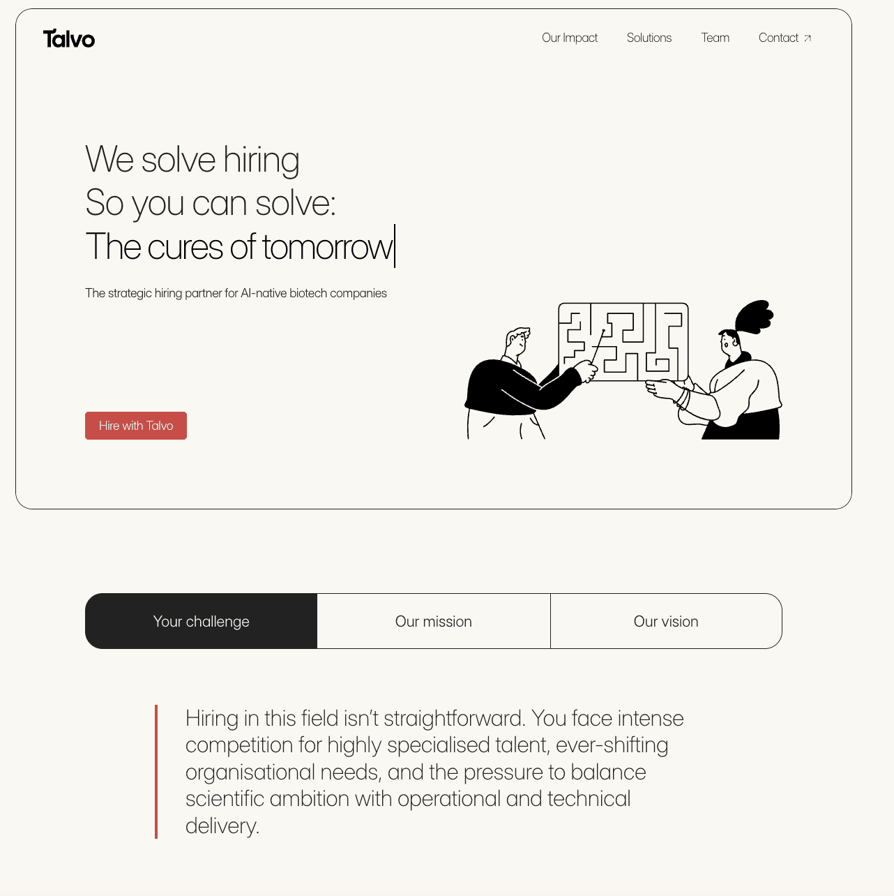 Talvo is an embedded recruitment company for pioneering biotech businesses changing the future of healthcare and research. Their determined approach and experience in the biotech space allows Talvo’s clients to focus on the groundbreaking work they are passionate about, knowing recruitment is taken care of by experts.
